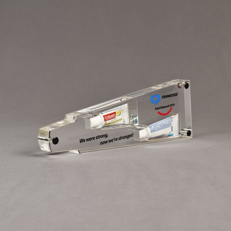 Created out of necessity but revered as one of our most popular product display acrylic awards in the USA. Each setting the standard for clarity — plus securely displaying your item to its full potential. An encasement is a perfect way to protect and enhance your components in a way that can be labeled for easy viewing or personalized to kick off a new product launch. Occasionally there are elements that are not able to be embedded in cast Lucite® — either because they are too pliable or chemically incompatible. Our large Allure™ Encasement is created up to 48 square inches with one of our high-speed lasers cutting the shape of your product in up to 1 1/4" thick clear acrylic sheets. Then by attaching an exact matched clear front and back layers held together with Chicago bolts — your components will be sandwiched exquisitely for display. Our encasements are often purchased by companies that need to display their products in a professional manner yet protect them from being handled. For instance, a trade show environment — where the product needs to travel well, be displayed for thousands of people to see — yet be permanently protected from potentially walking away or damage.